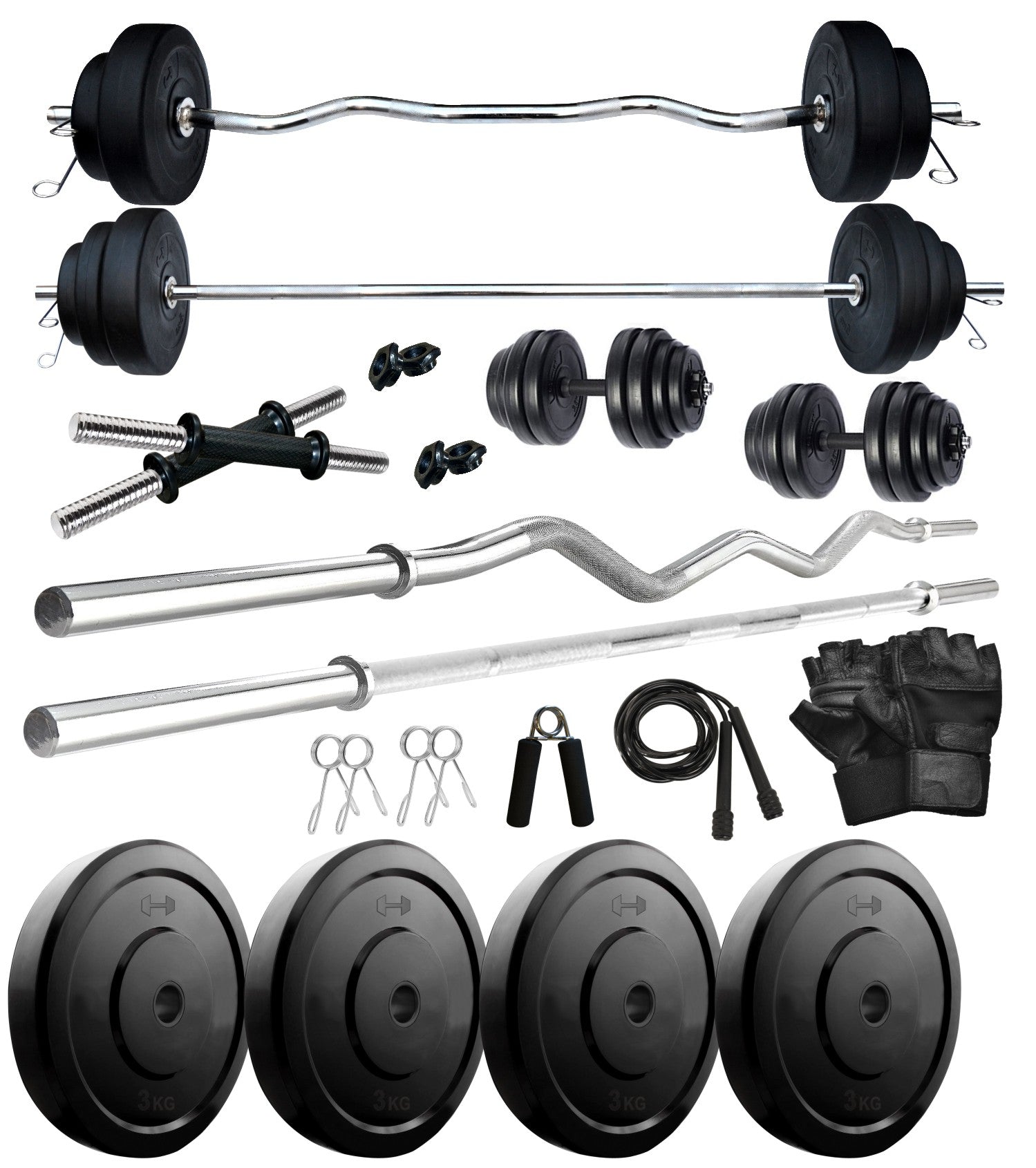 Weight Plates + 1 x 4 feet plain Rod (Shoulder / Bicep) + 1 x 3 feet curl rod + 2 x 14 " dumbbell Rods , 100% pure leather gym gloves + 1 Gym Backpack + 1 Skipping Rope + 1 Hand Gripper + 2 Locks and clippers comes with the rods,