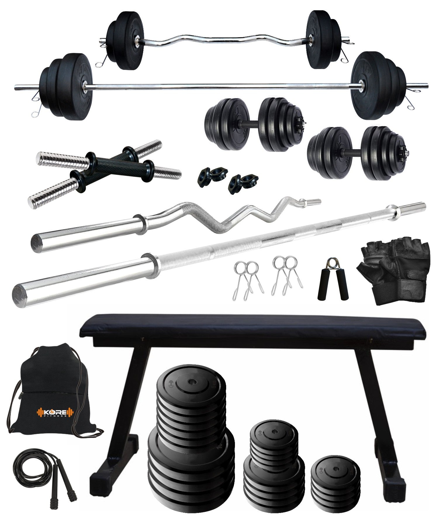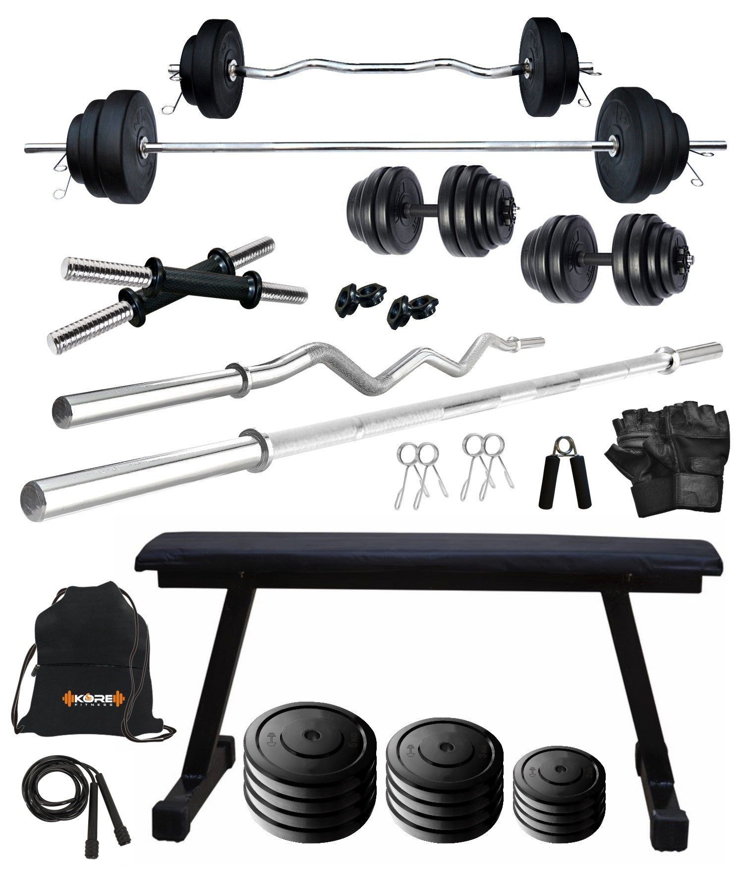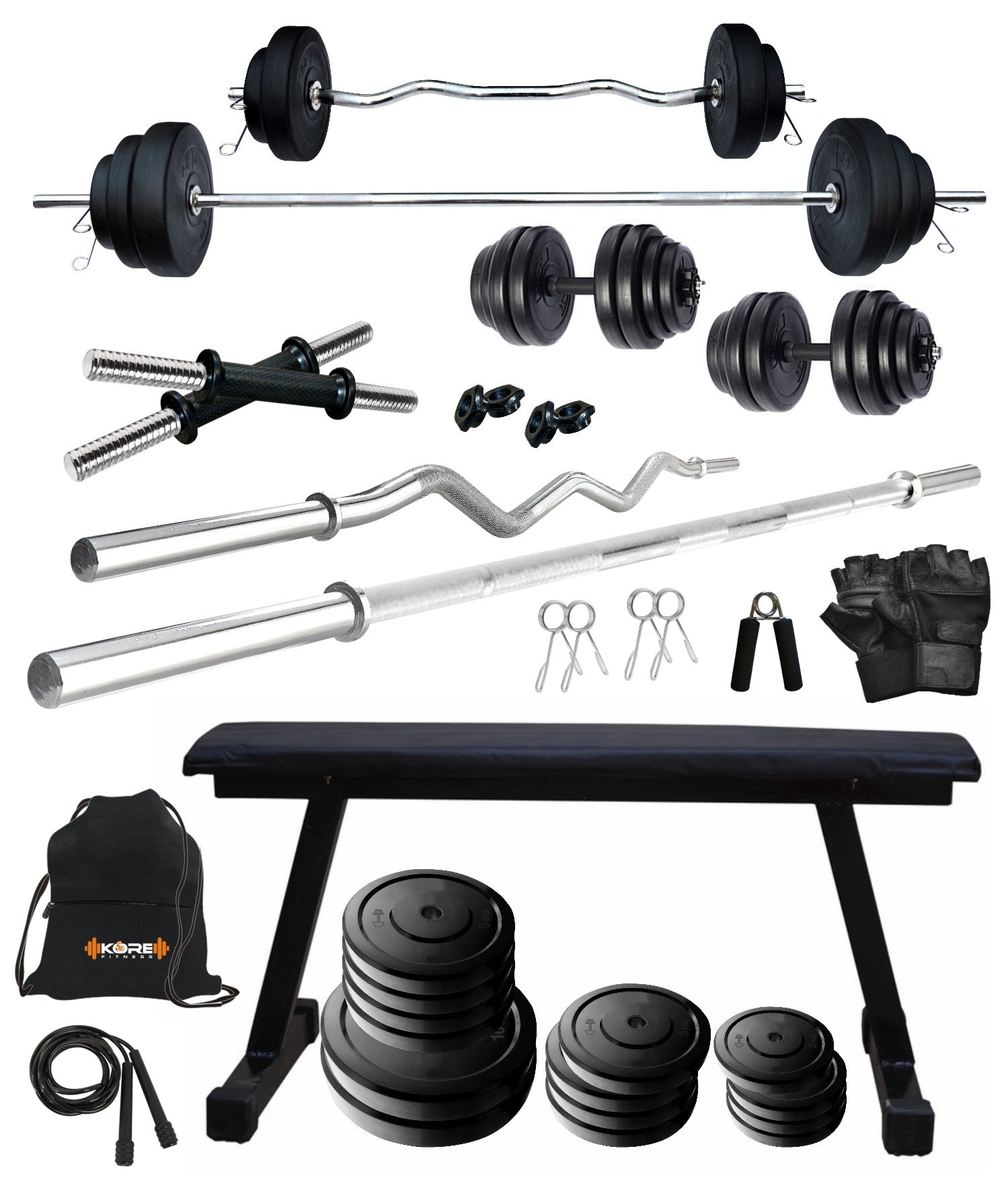 Kore 20-100 kg One 3 Ft Curl + 5 Ft Plain Rod and One Pair Dm Rods with Flat Bench and Gym Accessories (COMBO7)