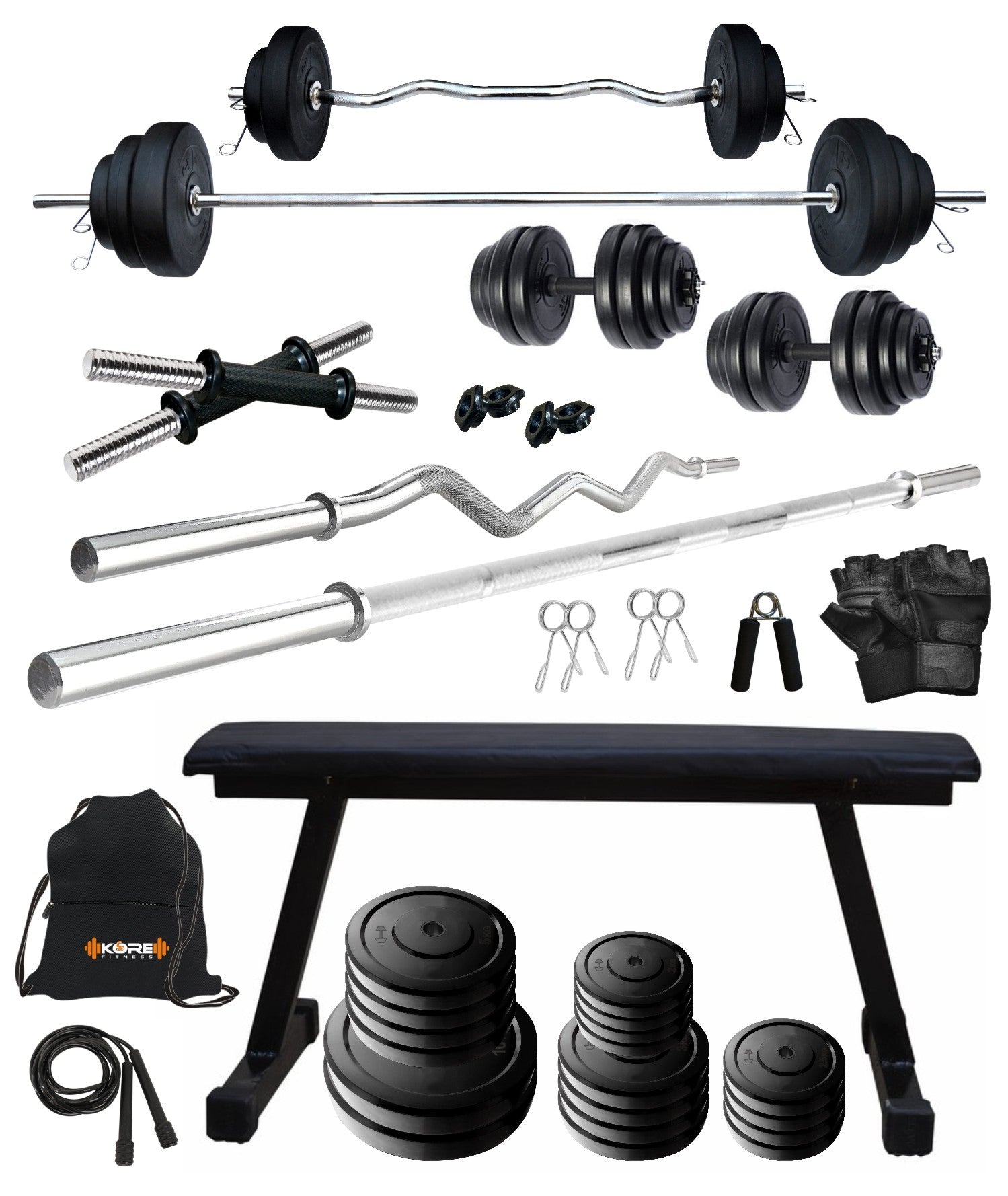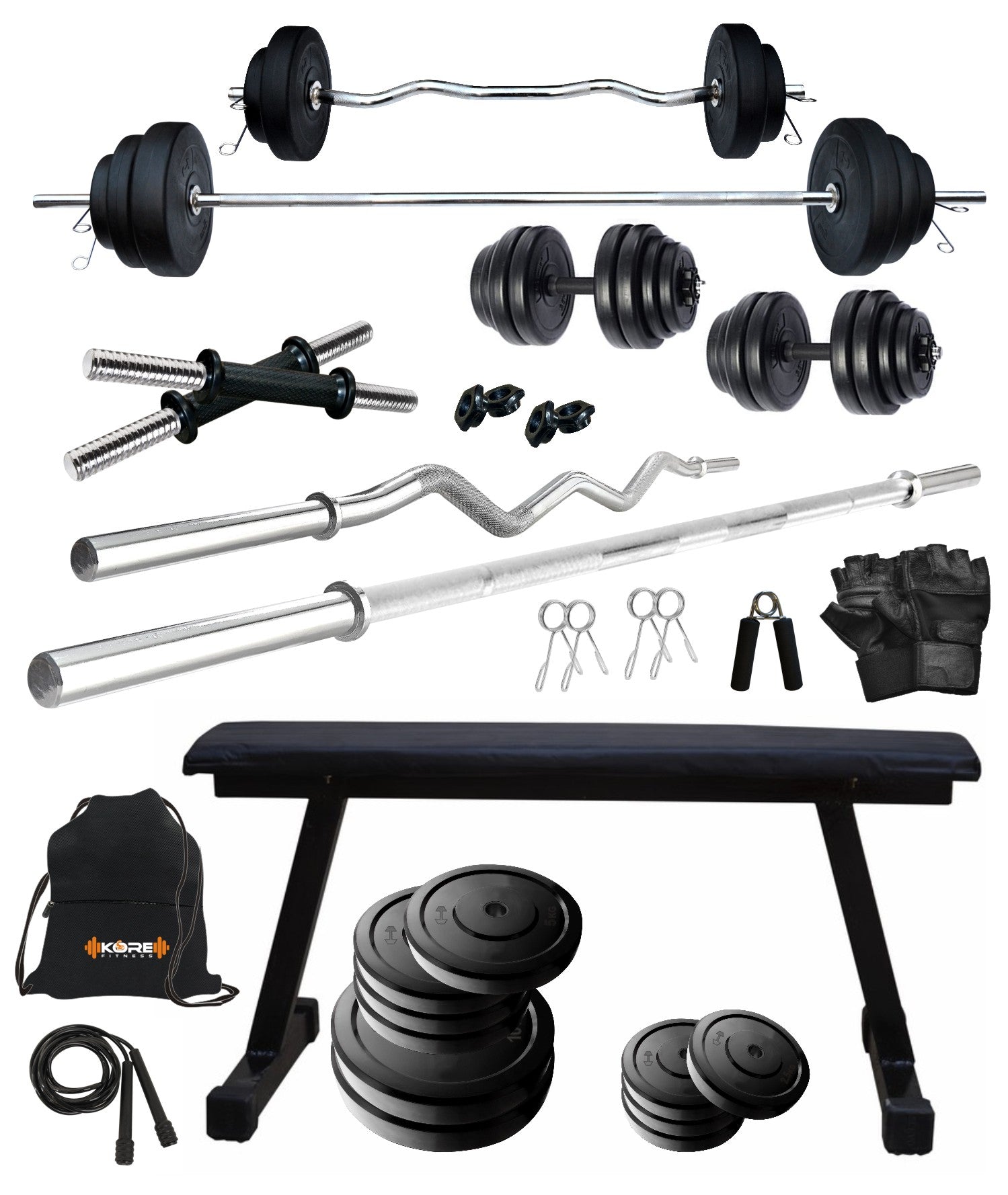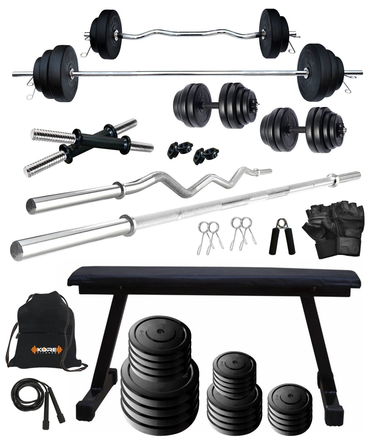 Kore 20-100 kg One 3 Ft Curl + 5 Ft Plain Rod and One Pair Dm Rods with Flat Bench and Gym Accessories (COMBO7)